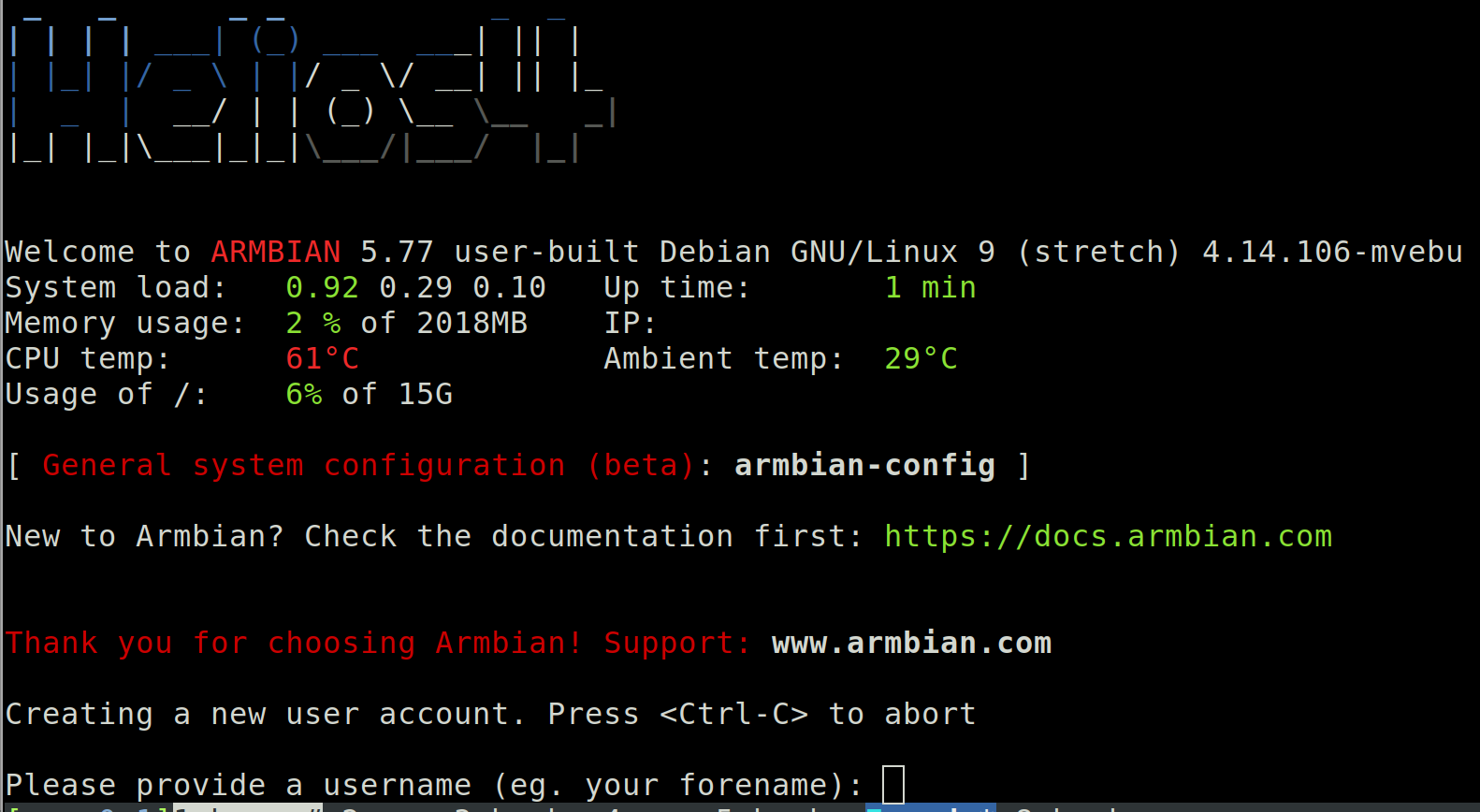 greys@xps:~$ sudo picocom -b 115200 /dev/ttyUSB0this will eventually show the fully booted OS and progress with Helios 4 setup: